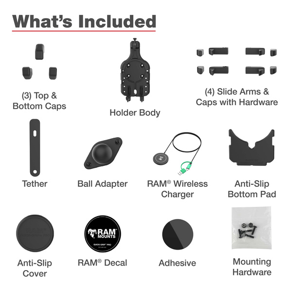 RAM Quick-Grip Pro s kuličkou a 15W bezdrátovou nabíječkou Qi2 (RAM-HOL-PD5B-W2MU) je další evolucí řady RAM Quick-Grip. Přepracovaný design s novým, elegantním vzhledem a integrovanými gumovými bočními rameny zajišťuje bezpečné držení telefonu bez sklouzávání. Tento držák telefonu je dodáván s bezdrátovou nabíječkou RAM Qi2 a je vybaven integrovanou dutinou pro její zajištění na místě. Tento držák telefonu je dodáván s protiskluzovým krytem zajišťujícím rovné uchycení, pokud není bezdrátový nabíjecí puk nainstalován. Držák RAM Quick-Grip Pro je vybaven pružinovou konstrukcí, která umožňuje snadné vložení a vyjmutí telefonu jednou rukou. Nastavitelná boční ramena zajišťují, že telefon zůstane v držáku zajištěn, aniž by blokoval jakékoli porty nebo tlačítka. Doplňte řešení sestavením svého držákuTento držák je kompatibilní s pamětí RAM a obsahuje diamantovou kuličku velikosti B, která se instaluje na vzor AMPS se dvěma otvory. Při použití tohoto držáku ve vozidle s otevřeným kokpitem doporučuje společnost RAM nainstalovat dodané poutko zařízení. Při určování celkové velikosti je důležité ověřit rozměry vašeho kapesního zařízení s pouzdrem, obalem nebo kůží.