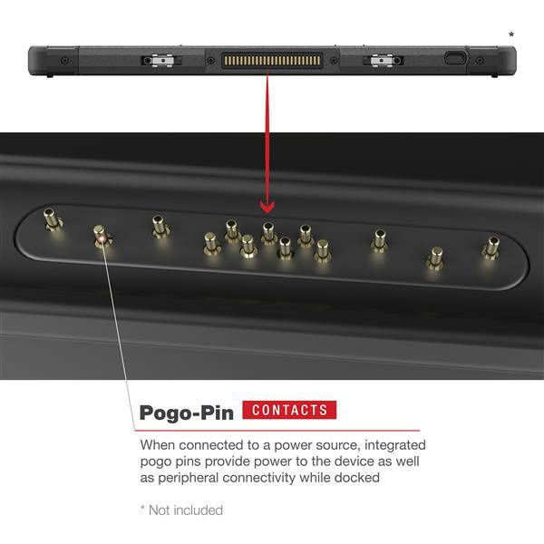 - Pružinový, klíčem uzamykatelný napájený dok umožňuje nabíjení tabletu Panasonic FZ-A3 prostřednictvím 5,5mm napájecího konektoru DC.
